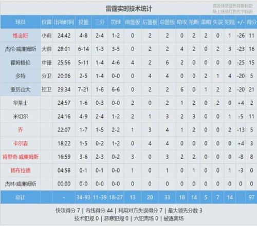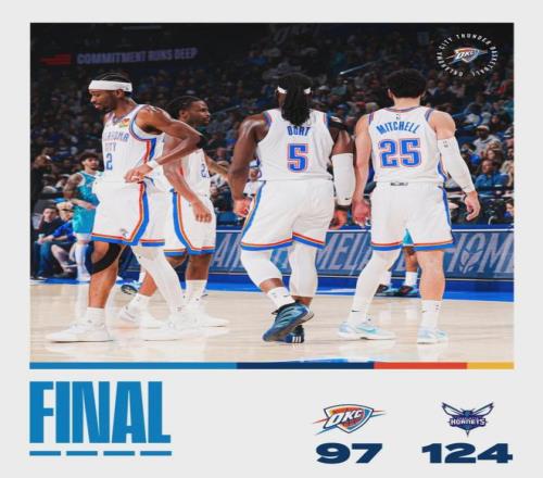 四节比分如下(黄蜂在前):33-33、34-17、32-21、25-26。单节17分,创造雷霆本赛季新低。亚历山大第二节6投0中,一分都没拿到。第四节雷霆最多落后30分,同样是本赛季纪录。雷霆首发五人组,正负值均低于-20!